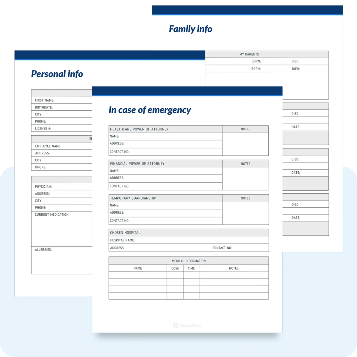 What it is: A professionally designed, printed workbook mailed directly to your door with fill-in-the-blank pages for all the essential information your family needs.