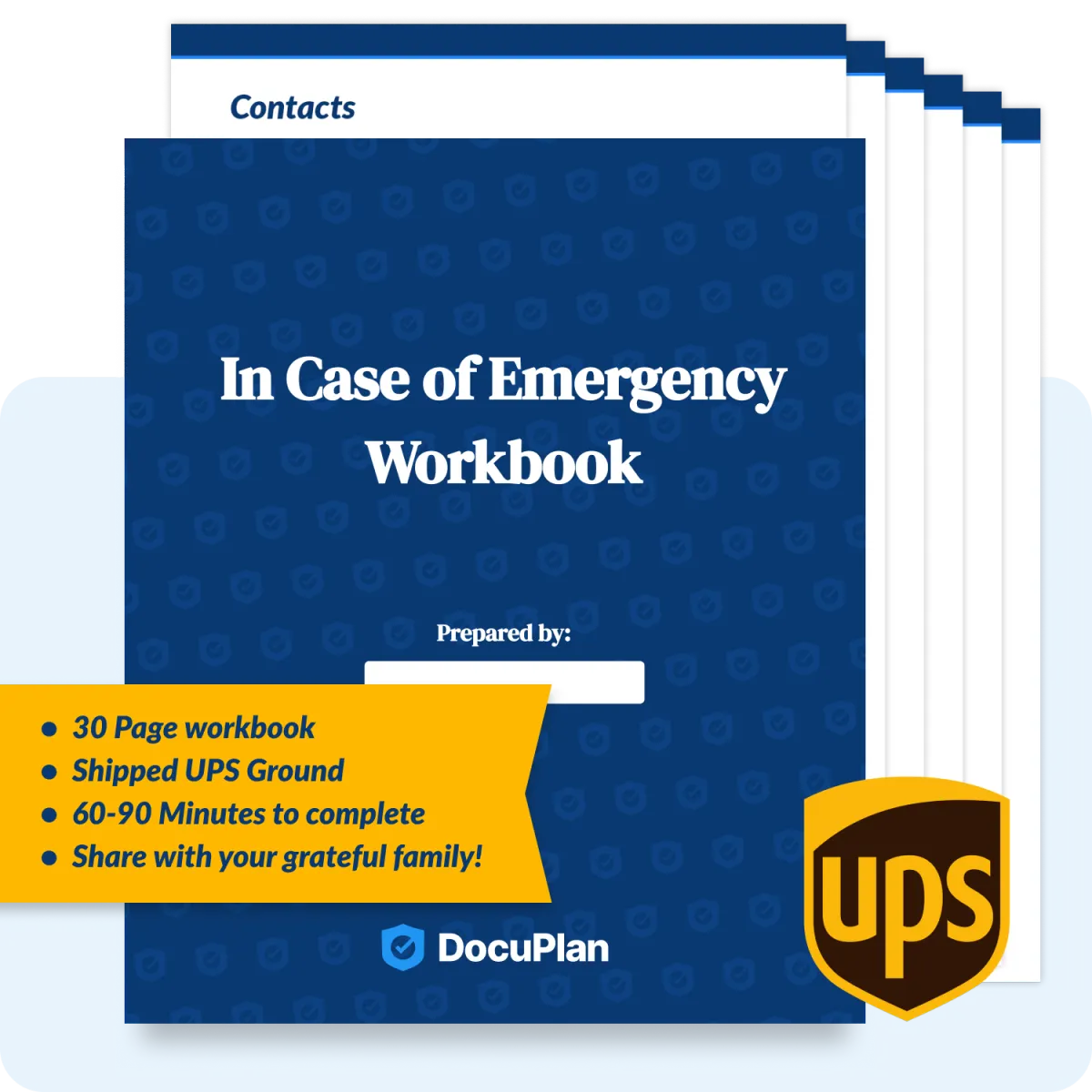 A Printed “In Case of Emergency” Workbook — shipped to your door, so you can record accounts, logins, documents, and key contacts in one place your family can actually use.